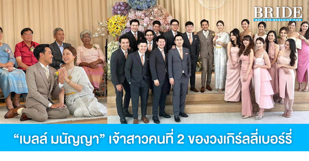 ขอแสดงความยินดีกับ เบลล์ มนัญญา วงเกิร์ลลี่เบอร์รี่ อดีตเกิร์ลกรุ๊ปยุค 90 เข้าพิธีวิวาห์กับแฟนหนุ่ม วิน อินธาระ ผู้จัดการโปรกอล์ฟระดับโลก บรรยากาศงานแต่งงานที่แสนเรียบง่ายแต่ดูอบอุ่นหวานชื่นมากๆ มีทั้งญาติของทั้งสองฝ่าย และเพื่อนซี้ร่วมวงเกิร์ลลี่เบอร์รี่ของ เบลล์ มากันครบทั้ง 3 คน กิ๊บซี่ วนิดา,กิ๊ฟท์ซ่า ปิยา และ แนนนี่ ภัสสณันฐ์ สำหรับเจ้าสาวมาในชุดไทยสวยมากๆ