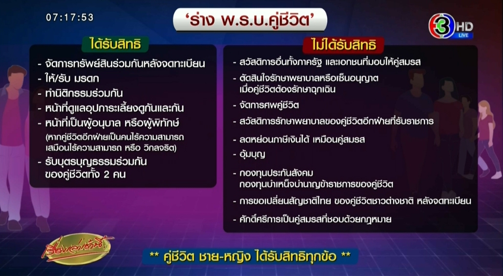 ทั้งนี้ ร่างพระราชบัญญัติคู่ชีวิต พ.ศ…. (พ.ร.บ. คู่ชีวิต) ผ่านคณะรัฐมนตรี (ครม.) แล้วก็จริง แต่จะต้องผ่านกระบวนการรับฟังความคิดเห็น ตามมาตรา 77 ของรัฐธรรมนูญแห่งราชอาณาจักรไทยปีพุทธศักราช2560 ในสภาผู้แทนราษฎรเสียก่อน.