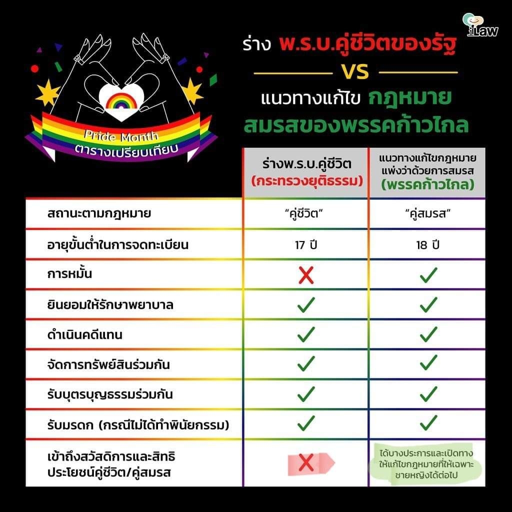 นอกจากนี้ ธัญญ์วาริน สุขะพิสิษฐ์ พร้อมด้วย ธัญวัจน์ กมลวงศ์วัฒน์ ส.ส.แบบบัญชีรายชื่อ พรรคก้าวไกล สัดส่วนผู้มีความหลากหลายทางเพศ ได้แถลงการณ์ผ่านร่างพ.ร.บ.คู่ชีวิตว่า ขอให้พี่น้องประชาชนอย่าเกิดความสับสน และขอทำความเข้าใจว่าร่างพระราชบัญญัติคู่ชีวิต พ.ศ…..( พ.ร.บ.คู่ชีวิต) เป็นคนละฉบับกับร่างพระราชบัญญัติแก้ไขประมวลกฎหมายแพ่งเเละพาณิชย์ มาตรา 1448 (สมรสเท่าเทียม) เพื่อการสมรสเท่าเทียมที่พรรคก้าวไกลเป็นผู้เสนอนั้นมีสาระสำคัญ คือ “คู่ชีวิตไม่เท่ากับสมรสเท่าเทียม” คือ การที่เราแก้ไขสมรสเท่าเทียม คำว่าคู่สมรสนั้น ถูกบัญญัติอยู่แล้วในกฎหมายทั่วไป ไม่ว่าจะเป็นสวัสดิการของราชการ สวัสดิการเอกชน ที่จะให้สิทธิ์กับคำว่าคู่สมรสและการสมรสเท่าเทียมจะปกป้องเเละดูเเลคู่สมรสให้ได้รับสิทธิอย่างเท่าเทียม เป็นการยืนอยู่อย่างเสมอภาคต่อหน้ากฎหมายของประเทศ