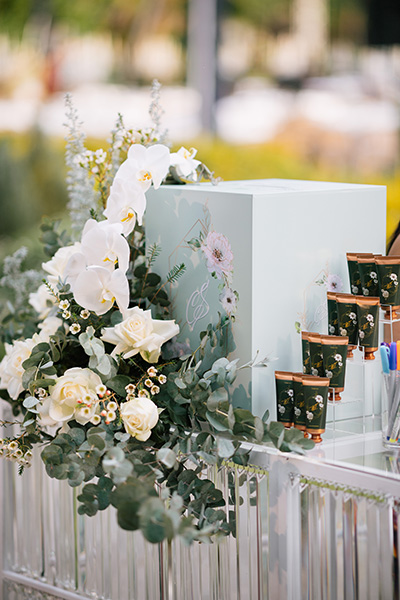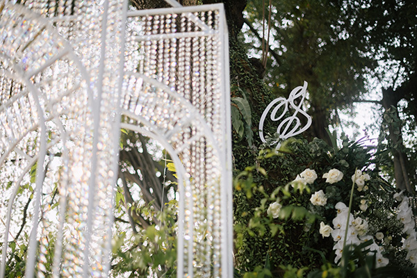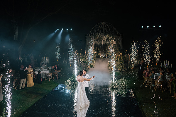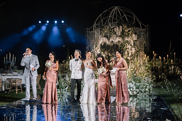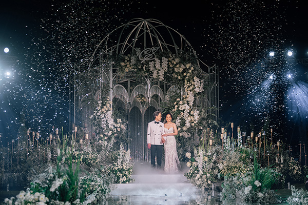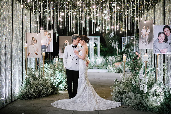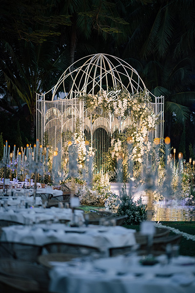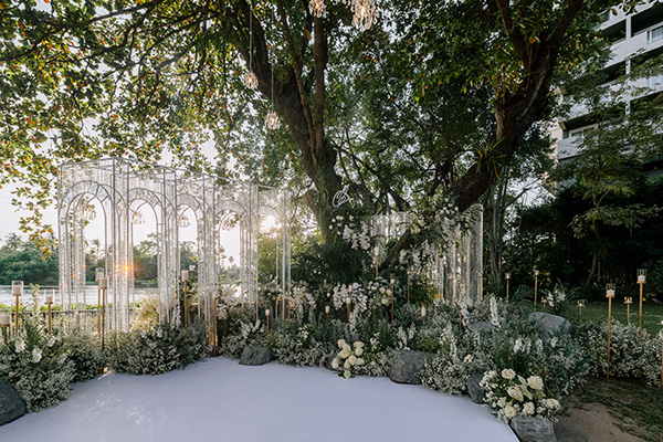พิธีแต่งงานกลางแจ้งที่เนรมิตสวนให้สวยหรูราวกับเทพนิยาย ด้วยซุ้มดอกไม้สีขาวและสีเขียวที่ถูกประดับประดาอย่างงดงาม และซุ้มไฟระย้า ที่ระยิบระยับราวกับดวงดาว สร้างความประทับใจให้กับแขกผู้มาเยือน รวมถึงช่วยขับให้เจ้าบ่าวและเจ้าสาวดูราวกับเจ้าชายและเจ้าหญิง ที่จับมือเต้นรำท่ามกลางบรรยากาศที่อบอวลไปด้วยความสุข