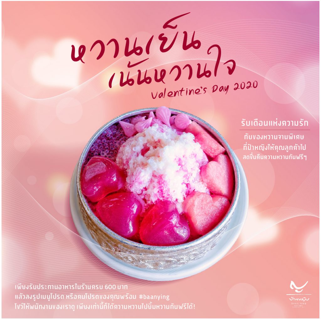 สำหรับคู่รักที่อยากทานเมนูง่ายๆ แต่เต็มไปด้วยความทรงจำ บ้านหญิง (Baan Ying) ณ ชั้น 3 สยามเซ็นเตอร์ ก็พร้อมเสิร์ฟเมนูในตำนานอย่าง ข่าวไข่ข้น ที่คู่รักคู่ใดโตมากับความเป็นสยามก็จะต้องรู้จักเมนูนี้อย่างแน่นอน โดยข้าวไข่ข้นของบ้านหญิงในทุกวันนี้สามารถออกแบบส่วนผสมได้ตามใจผู้ทานอีกด้วย แต่สำหรับเทศกาลวาเลนไทน์ที่จะถึงนี้บ้านหญิงยินดีจะร่วมฉลองความรักของคู่รักที่เลือกมาทานอาหารที่ร้านด้วยเมนูเพิ่มความหวานอย่าง หวานเย็นเน้นหวานใจ เมนูขนมหวานสุดพิเศษที่มีให้ทานเฉพาะช่วงวาเลนไทน์เท่านั้น โดยเมนูนี้เต็มไปด้วยวัตถุดิบหวานชื่นใจหลายอย่าง ไม่ว่าจะเป็น แตงโมรูปหัวใจ วุ้นรูปหัวใจ อาลัว น้ำแดงกลิ่นกุหลาบ และอื่นๆ อีกหลายอย่าง โดยบ้านหญิงตั้งใจทำขึ้นเพื่อฉลองความหวานของความรักในเทศกาลวาเลนไทน์นี้โดยเฉพาะ เพียงรับประทานอาหารในร้านครบ 600 บาท และลงรูปเมนูโปรดหรือคนโปรดของคุณพร้อม #baanying แล้วแสดงกับพนักงานก็รับเมนูขนมหวานที่หาทานที่ไหนไม่ได้นอกจากที่บ้านหญิง ไปทานร่วมกันได้ฟรีทันทีตั้งแต่วันที่ 14 – 29 กุมภาพันธ์ 2563 นับเป็นการจบมื้อพิเศษในหนึ่งวันสำคัญของคนมีคู่ได้อย่างมีสีสันแต่เรียบง่ายเลยมากเลยทีเดียว