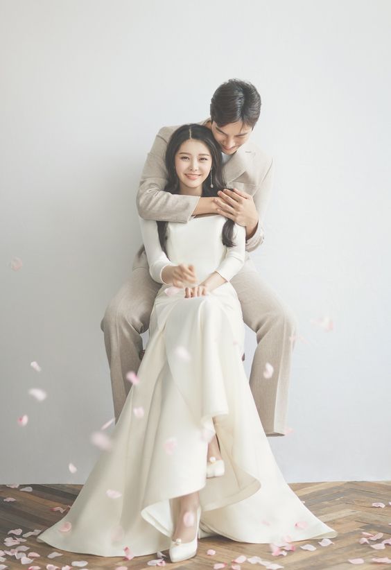 อาจจะเป็นในสตูดิโอ ห้องในบ้านหรือที่ไหนก็ได้ เพราะพื้นหลังสีเรียบๆ หาง่ายที่สุด แม้จะดูเหมือนไม่มีอะไร แต่มันก็ทำให้ไม่ต้องคิดเยอะ และยังทำให้ผู้พบเห็นโฟกัสไปที่คู่บ่าวสาวมากกว่าที่จะสนใจแบ็คกราวน์อื่นๆ แค่ได้โพสท่าถ่ายรูปด้วยกัน ยิ้มให้กันก็เป็นภาพที่มีความสุขแล้ว