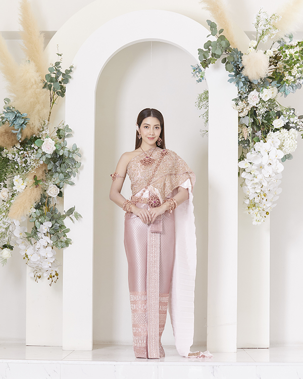 “ชุดไทยจักรพรรดิ “ ชุดนี้ตัดเย็บจากผ้าใหมยกดอกลำพูนสีโรสโกลด์ทอสอดดิ้นลายดอกพิกุล ห่มสไบสีชมพูกุหลาบและทับด้วยสไบปักลายดอกผสมเครือเถาสีพิงค์โกลด์ ประดับด้วยเครื่องถนิมพิมพาภรณ์สีโรสโกลด์ฝังพลอยแดงล้อมเพชรซีกลงยาสีอย่างโบราณ