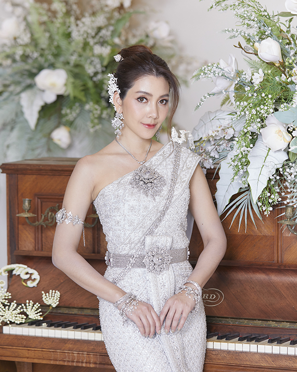 “ชุดไทยจักรี”ตัดเย็บจากผ้ายกอินเดียสีขาว สอดดิ้นเงินลายพิกุล นำมาปักด้วยคริสตัลและวัสดุประกอบการปักเกรดพรีเมี่ยมทั้งชุด สวมเครื่องถนิมพิมพาภรณ์สีเงินฝังพลอยขาวล้อมเพชรซีก