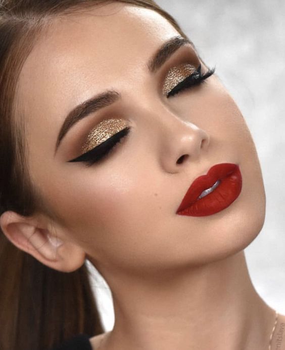 อีกหนึ่งสีสันที่เข้ากับสีแดงมาก ๆ นั่นก็คือสีทอง ซึ่งอายแชโดว์สีทองที่มีกลิตเตอร์หนัก ๆ หรือชิมเมอร์ประกายแวววาว จะขับให้ดวงตาดูโดดเด่นมากยิ่งขึ้น อาจจะเพิ่มมิติให้ดวงตาด้วยการคัดเบ้าตาด้วยอายแชโดว์เนื้อแมตต์สีน้ำตาลเข้ม และกรีดอายไลเนอร์อีกสักหน่อย ก็จะได้ลุคเจ้าสาวสุดหรูหรา ที่ใคร ๆ ก็อยากหันมอง