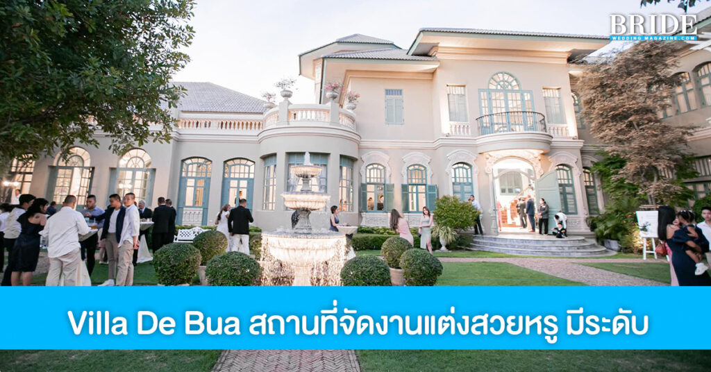Bride พาชมสถานที่จัดงานแต่งสไตล์โคโลเนียล บรรยากาศแสนอบอุ่น ที่บ่าวสาวต้องหลงรัก Villa De Bua (วิลลา เดอ บัว) ตัวอาคารงดงามในโทนสีครีมและเขียว ให้กลิ่นอายวังเก่าหรือบ้านขุนนางสมัยต้นกรุงรัตนโกสินทร์ ที่นี่ไม่เพียงแค่เหมาะกับการจัดงานแต่งสไตล์ไทยประยุกต์เท่านั้น ยังรองรับได้ทั้งสไตล์สากลและจีน ด้วยพื้นที่จัดงานหลากหลายรูปแบบและกว้างขวาง ให้บ่าวสาวเลือกตกแต่งได้ตามธีมและสไตล์ที่ต้องการ อีกทั้งมีบริการจัดงานแบบ One Stop Wedding Service รวมถึงทีมงานมืออาชีพ ที่จะช่วยรังสรรค์งานให้อบอุ่น โรแมนติก คู่บ่าวสาวจะได้เริ่มต้นชีวิตคู่ที่น่าประทับใจอย่างที่สุด