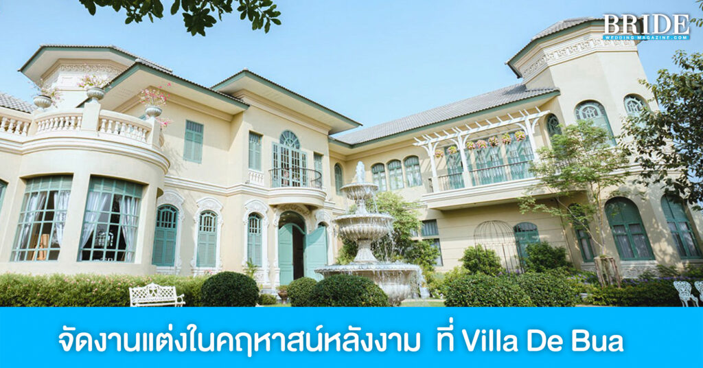 การจัดงานแต่งในบรรยากาศวังเก่า เป็นอีกหนึ่งความฝันของคู่รัก ที่ Villa De Bua (วิลลา เดอ บัว) พร้อมสานฝันให้เป็นจริง ที่นี่โดดเด่นด้วยคฤหาสน์หรูสไตล์โคโลเนียล ตกแต่งสวยงาม พื้นที่กว้างขวาง บรรยากาศอบอุ่นและมีความเป็นส่วนตัว อีกทั้งไม่ต้องกังวลเรื่องพิธีการต่างๆ เพราะมีทีมงานมืออาชีพให้คำแนะนำ ไม่ว่าจะเป็นพิธีสงฆ์ พิธีหมั้น รดน้ำสังข์ รับไหว้ผู้ใหญ่ และพิธีส่งตัว สามารถจัดได้ครบทุกพิธี รวมไปถึงการจัดเลี้ยงฉลอง ซึ่งคู่รักสามารถออกแบบงานในแบบตัวเองได้ โดยทีมงานพร้อมดูแลอย่างใกล้ชิด รับรองได้ว่าภาพฝันวันแต่งงานของคุณจะเปลี่ยนเป็นงานที่สมบูรณ์แบบและน่าจดจำ